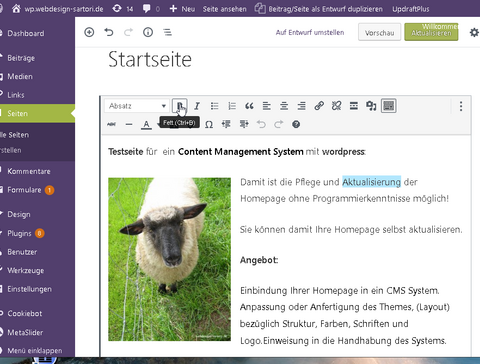 Änderungen von Texten und Bildern der angelegten Seiten.